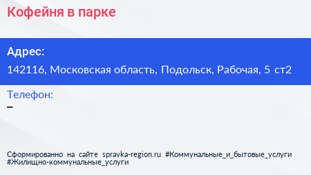 Кофейня в парке по адресу 142116, Московская область, Подольск, Рабочая, 5 ст2 в дальнейшем Организация, размещена в следующих категориях: