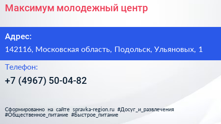Максимум, молодежный центр по адресу 142116, Московская область, Подольск, Ульяновых, 1 в дальнейшем Организация, размещена в следующих категориях: