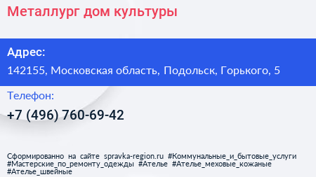 Металлург, дом культуры по адресу 142155, Московская область, Подольск, Горького, 5 в дальнейшем Организация, размещена в следующих категориях: