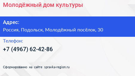 Молодёжный, дом культуры по адресу Дом культуры Молодежный, 30, Дорожная улица, Малое Толбино, Молодёжный, городской округ Подольск, Московская область, Центральный федеральный округ, 142113, Россия в дальнейшем Организация, размещена в следующих категориях: