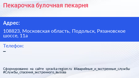 Пекарочка, булочная-пекарня по адресу 108823, Московская область, Подольск, Рязановское шоссе, 11а в дальнейшем Организация, размещена в следующих категориях: