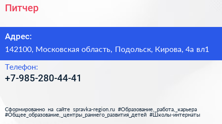 Питчер по адресу 142100, Московская область, Подольск, Кирова, 4а вл1 в дальнейшем Организация, размещена в следующих категориях: