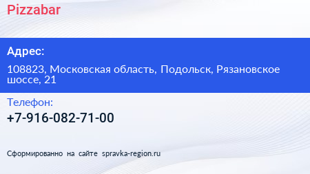 Pizzabar по адресу 108823, Московская область, Подольск, Рязановское шоссе, 21 в дальнейшем Организация, размещена в следующих категориях: