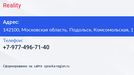 Reality по адресу 142100, Московская область, Подольск, Комсомольская, 1 в дальнейшем Организация, размещена в следующих категориях: