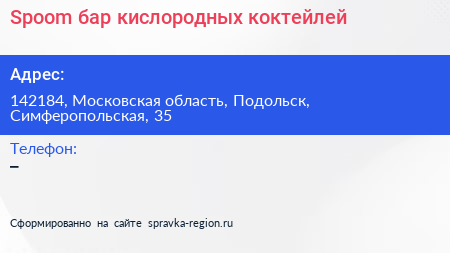 Spoom, бар кислородных коктейлей по адресу 142184, Московская область, Подольск, Симферопольская, 35 в дальнейшем Организация, размещена в следующих категориях: