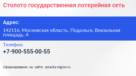 Столото, государственная лотерейная сеть по адресу 142116, Московская область, Подольск, Вокзальная площадь, 4 в дальнейшем Организация, размещена в следующих категориях: