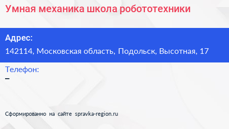 Умная механика, школа робототехники по адресу 142114, Московская область, Подольск, Высотная, 17 в дальнейшем Организация, размещена в следующих категориях: