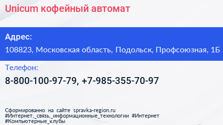 Unicum, кофейный автомат по адресу 108823, Московская область, Подольск, Профсоюзная, 1Б в дальнейшем Организация, размещена в следующих категориях: