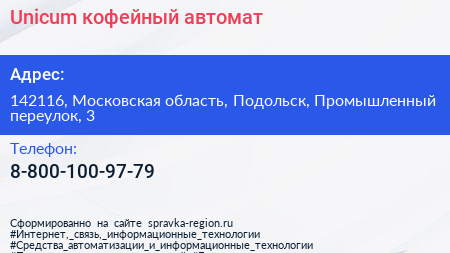 Unicum, кофейный автомат по адресу 142116, Московская область, Подольск, Промышленный переулок, 3 в дальнейшем Организация, размещена в следующих категориях: