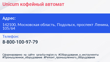 Unicum, кофейный автомат по адресу 142100, Московская область, Подольск, проспект Ленина, 105/64 в дальнейшем Организация, размещена в следующих категориях:
