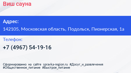 Виш, сауна по адресу 142105, Московская область, Подольск, Пионерская, 1а в дальнейшем Организация, размещена в следующих категориях: