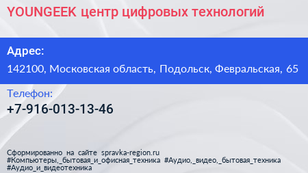 YOUNGEEK, центр цифровых технологий по адресу 142100, Московская область, Подольск, Февральская, 65 в дальнейшем Организация, размещена в следующих категориях: