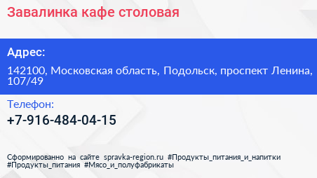 Завалинка, кафе-столовая по адресу 142100, Московская область, Подольск, проспект Ленина, 107/49 в дальнейшем Организация, размещена в следующих категориях: