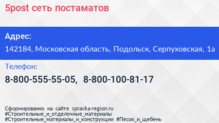 5post, сеть постаматов по адресу 142184, Московская область, Подольск, Серпуховская, 1а в дальнейшем Организация, размещена в следующих категориях: