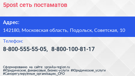 5post, сеть постаматов по адресу 142180, Московская область, Подольск, Советская, 10 в дальнейшем Организация, размещена в следующих категориях: