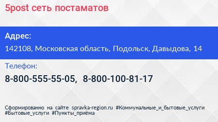 5post, сеть постаматов по адресу 142108, Московская область, Подольск, Давыдова, 14 в дальнейшем Организация, размещена в следующих категориях: