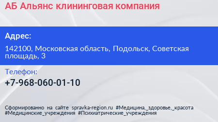 АБ Альянс, клининговая компания по адресу 142100, Московская область, Подольск, Советская площадь, 3 в дальнейшем Организация, размещена в следующих категориях: