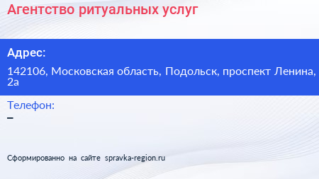 Агентство ритуальных услуг по адресу 142106, Московская область, Подольск, проспект Ленина, 2а в дальнейшем Организация, размещена в следующих категориях: