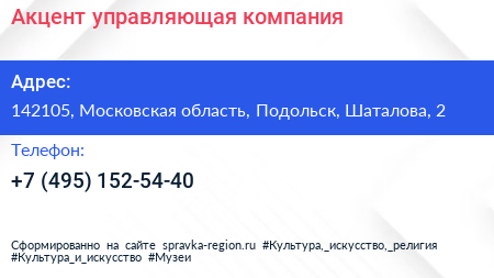 Акцент, управляющая компания по адресу 142105, Московская область, Подольск, Шаталова, 2 в дальнейшем Организация, размещена в следующих категориях: