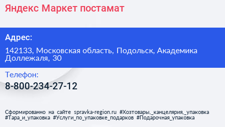 Яндекс.Маркет, постамат по адресу 142133, Московская область, Подольск, Академика Доллежаля, 30 в дальнейшем Организация, размещена в следующих категориях: