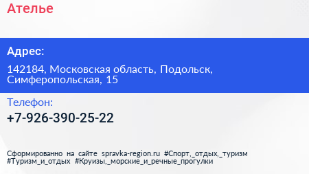 Ателье по адресу 142184, Московская область, Подольск, Симферопольская, 15 в дальнейшем Организация, размещена в следующих категориях: