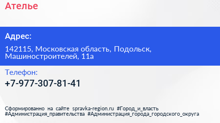Ателье по адресу 142115, Московская область, Подольск, Машиностроителей, 11а в дальнейшем Организация, размещена в следующих категориях: