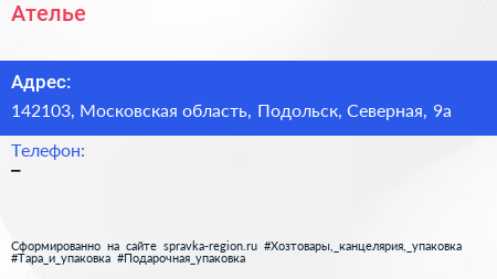 Ателье по адресу 142103, Московская область, Подольск, Северная, 9а в дальнейшем Организация, размещена в следующих категориях: