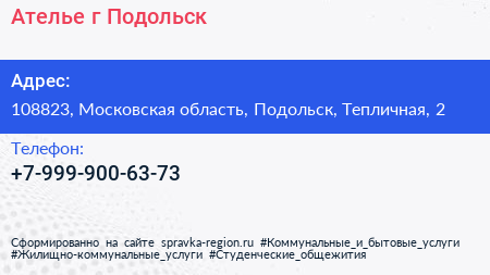 Ателье, г. Подольск по адресу 108823, Московская область, Подольск, Тепличная, 2 в дальнейшем Организация, размещена в следующих категориях: