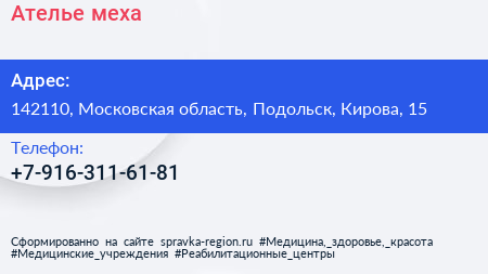 Ателье меха по адресу 142110, Московская область, Подольск, Кирова, 15 в дальнейшем Организация, размещена в следующих категориях: