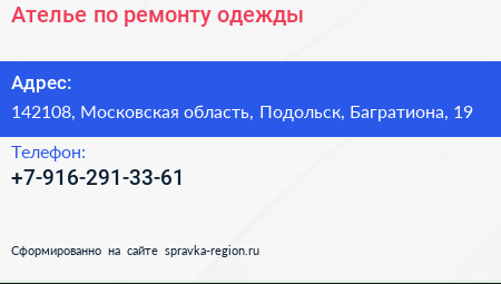 Ателье по ремонту одежды по адресу 142108, Московская область, Подольск, Багратиона, 19 в дальнейшем Организация, размещена в следующих категориях: