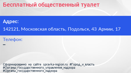 Бесплатный общественный туалет по адресу 142121, Московская область, Подольск, 43 Армии, 17 в дальнейшем Организация, размещена в следующих категориях: