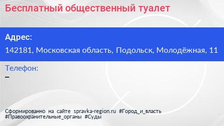 Бесплатный общественный туалет по адресу 142181, Московская область, Подольск, Молодёжная, 11 в дальнейшем Организация, размещена в следующих категориях: