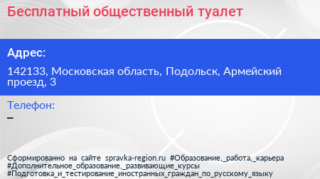 Бесплатный общественный туалет по адресу 142133, Московская область, Подольск, Армейский проезд, 3 в дальнейшем Организация, размещена в следующих категориях: