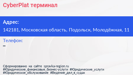 CyberPlat, терминал по адресу 142181, Московская область, Подольск, Молодёжная, 11 в дальнейшем Организация, размещена в следующих категориях:
