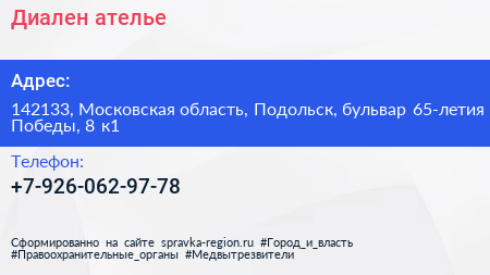 Диален, ателье по адресу 142133, Московская область, Подольск, бульвар 65-летия Победы, 8 к1 в дальнейшем Организация, размещена в следующих категориях: