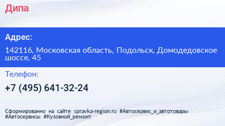 Дипа по адресу 142116, Московская область, Подольск, Домодедовское шоссе, 45 в дальнейшем Организация, размещена в следующих категориях: