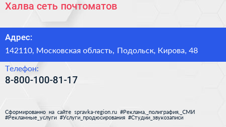 Халва, сеть почтоматов по адресу 142110, Московская область, Подольск, Кирова, 48 в дальнейшем Организация, размещена в следующих категориях: