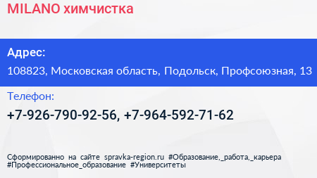 MILANO, химчистка по адресу 108823, Московская область, Подольск, Профсоюзная, 13 в дальнейшем Организация, размещена в следующих категориях: