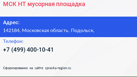 МСК-НТ, мусорная площадка по адресу 142184, Московская область, Подольск, в дальнейшем Организация, размещена в следующих категориях: