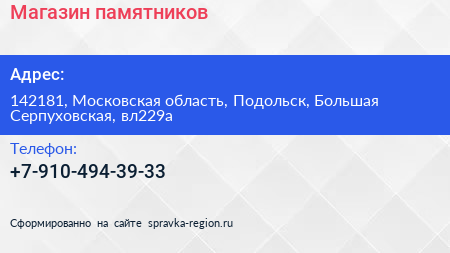 Магазин памятников по адресу 142181, Московская область, Подольск, Большая Серпуховская, вл229а в дальнейшем Организация, размещена в следующих категориях: