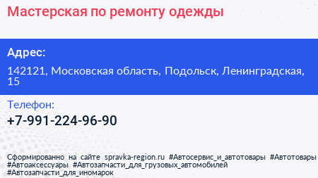 Мастерская по ремонту одежды по адресу 142121, Московская область, Подольск, Ленинградская, 15 в дальнейшем Организация, размещена в следующих категориях:
