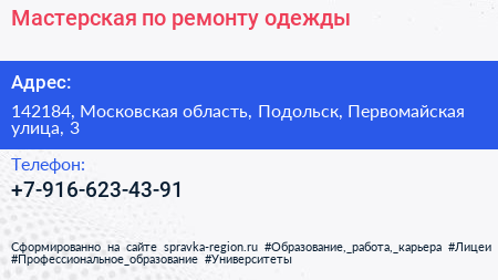 Мастерская по ремонту одежды по адресу 142184, Московская область, Подольск, Первомайская улица, 3 в дальнейшем Организация, размещена в следующих категориях: