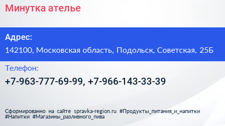 Минутка, ателье по адресу 142100, Московская область, Подольск, Советская, 25Б в дальнейшем Организация, размещена в следующих категориях: