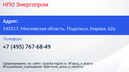 НПО Энергопром по адресу 142117, Московская область, Подольск, Кирова, 62а в дальнейшем Организация, размещена в следующих категориях:
