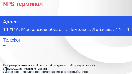 NPS, терминал по адресу 142116, Московская область, Подольск, Лобачева, 14 ст1 в дальнейшем Организация, размещена в следующих категориях: