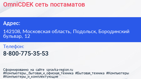OmniCDEK, сеть постаматов по адресу 142108, Московская область, Подольск, Бородинский бульвар, 12 в дальнейшем Организация, размещена в следующих категориях: