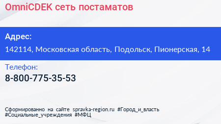 OmniCDEK, сеть постаматов по адресу 142114, Московская область, Подольск, Пионерская, 14 в дальнейшем Организация, размещена в следующих категориях: