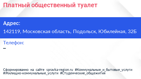 Платный общественный туалет по адресу 142119, Московская область, Подольск, Юбилейная, 32Б в дальнейшем Организация, размещена в следующих категориях: