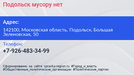 Подольск мусору нет по адресу 142100, Московская область, Подольск, Большая Зеленовская, 50 в дальнейшем Организация, размещена в следующих категориях: