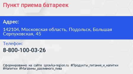 Пункт приема батареек по адресу 142104, Московская область, Подольск, Большая Серпуховская, 45 в дальнейшем Организация, размещена в следующих категориях: